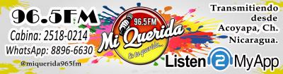 Transmitiendo desde Acoyapa, Chontales - Nicaragua. Somos una radio con perfil para todo publico. 96.5 FM, Radio Mi Querida, con un audio de calidad para nuestros oyentes. Comunicate con nosotros Linea Convencional 2518-0214 WhatsApp 5749-4754 Linea Tigo 8164-8137 Linea Claro 5749-4754 Siguenos en nuestras redes sociales para que te mantengas informado de todo lo que acontece em nuestro territorio local, nacional e internacional